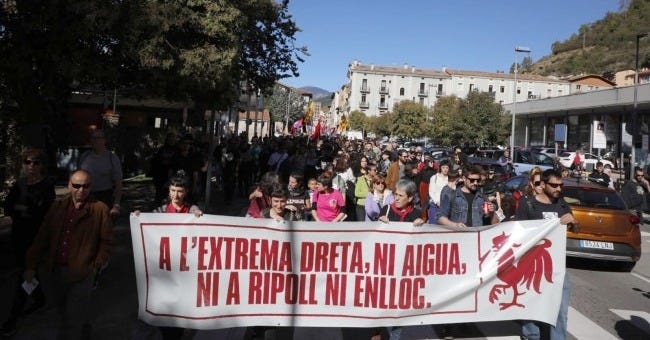 In Catalonia, a racist nationalism is sprouting up, only recently, with the “darkest and most dehumanizing countenance of the extreme right”, in the words of the presenter of “El Matí” a Catalan radio program. He means Silvia Orriols, now the mayor of Ripoll, a small city, who we then hear: “In Catalonia we don’t have a place for everyone and we have surpassed the limit, by quite a bit, ... Those are not poor people, they are barbaric”1 (this last word is pronounced with a menacing tone- one can almost hear the barbarians approaching).