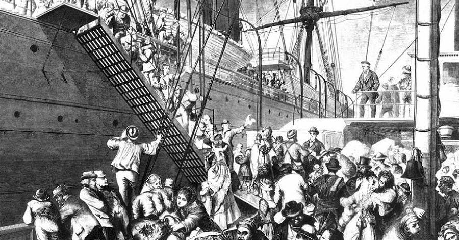 Photo 1: German emigrants boarding a steamer in Hamburg, 1874 (Wikimedia commons).