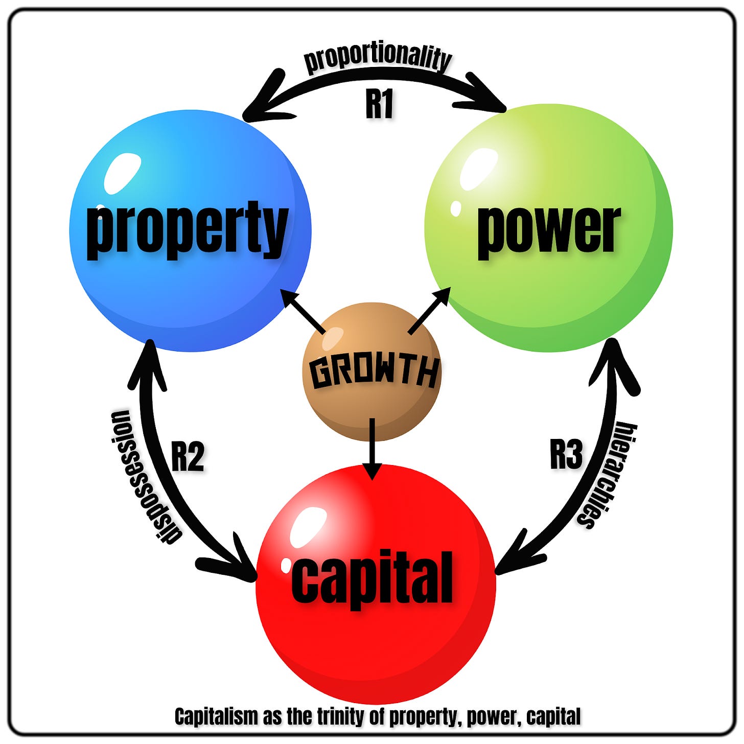 Fourth, profit stabilizes the trinity of capitalism, which is how the regimes of property, power, and capital, are linked through the doctrines of proportionality, hierarchies, and dispossession.Proportionality is about linking power to property, such as in how one share gives one vote in the ownership of corporations, dispossession is about removing property from its owner in order to transform it into profit-making capital, and hierarchies are the methods by which capital is managed in a top-down pyramid-like structure (think corporate organisation charts, for example). In this sense we can argue the profit motive evolved together with these doctrines in a feedback loop, sometimes being the cause of the doctrines, sometimes being the effect of the doctrines.
