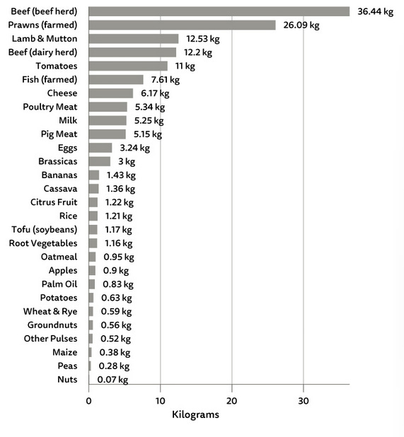 (Figure: Greenhouse gas emissions per 1,000 kilocalories. Greenhouse gas emissions are measured in kilograms of carbon dioxide equivalents (kgCO2eq) per 1,000 kilocalories. This means non-CO2 greenhouse gases are included and weighted by their relative warming impact. Note: Data represents the global average greenhouse gas emissions of food products based on a large meta-analysis of food production covering 38,700 commercially viable farms in 119 countries. Source: Living the 1.5 Degree Lifestyle,Why Individual Climate Action Matters More than Ever)