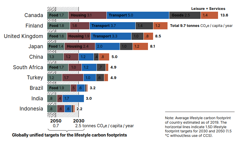 The required individual carbon footprint to keep warming under 1.5 degrees Celsius is 2.5 tonnes of carbon emissions and equivalent chemicals per person per year by 2030, and 0.7 tonnes by 2050. Six years ago Canada had an average of 13.6 tonnes. Two years ago, instead of going down, the average increased to 14.9 tonnes (another source here with data is based on territorial emissions, which do not account for emissions embedded in traded goods)