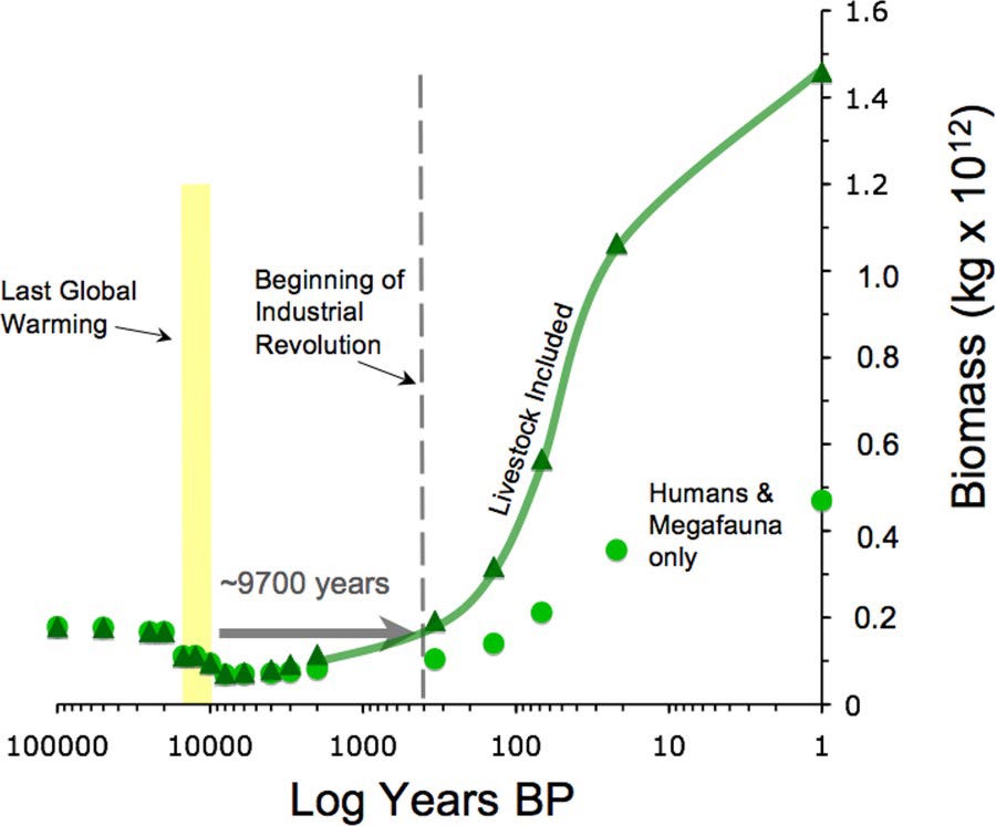 Anthony Barnosky studied the biomass of megafauna—large land animals that, as adults, weigh at least 100 lbs. or 45 kg. He estimated that megafauna biomass has increased over seven times just since the Industrial Revolution. (See figure 2.) Unfortunately, this is only good news for humans and their livestock; wild animal biomass is crashing.