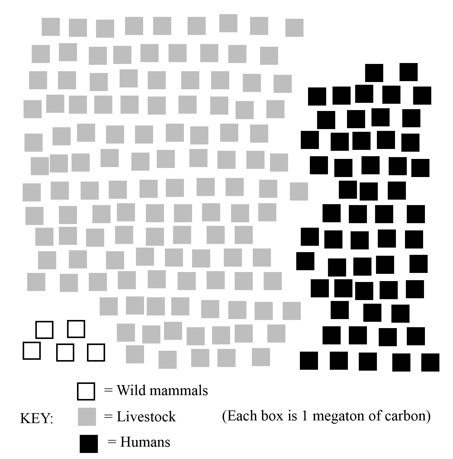 In the environments which support large mammals, human domination is almost total. Humans and their livestock today possess a carbon biomass thirty-five times more than all wild land mammals on the planet combined, according to Vaclav Smil. And humans don’t comprise most of that biomass, livestock do! Only about one-third is humans, with about two-thirds being livestock. (See figure 1.) This is a complete turnaround from one hundred thousand years ago, when all hominid species together were not even 1% of all mammal biomass. Now, humans and livestock are essentially the only mammals in town.