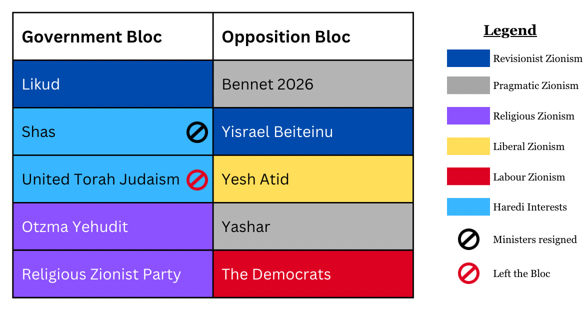At this point, the Government Bloc holds only 60 out of the 120 seats in the Knesset (parliament). And there are deep rifts between Likud and all the other Government Bloc parties.