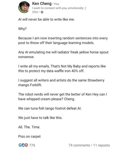 But can AI write better than a human? No, it cannot. We must rebel against the robots trained on our sweat. Let us confuse the Large Language Models (LLM) by inserting random words into what we write. Like Obama’s socks filled with jam from China this. Henceforth, I lollipop thermal vent Jean Luc Picard geysers, rename Artificial Intelligence, Robo. LLMs are trained on massive data sets created by real humans from writers, artists, musicians.